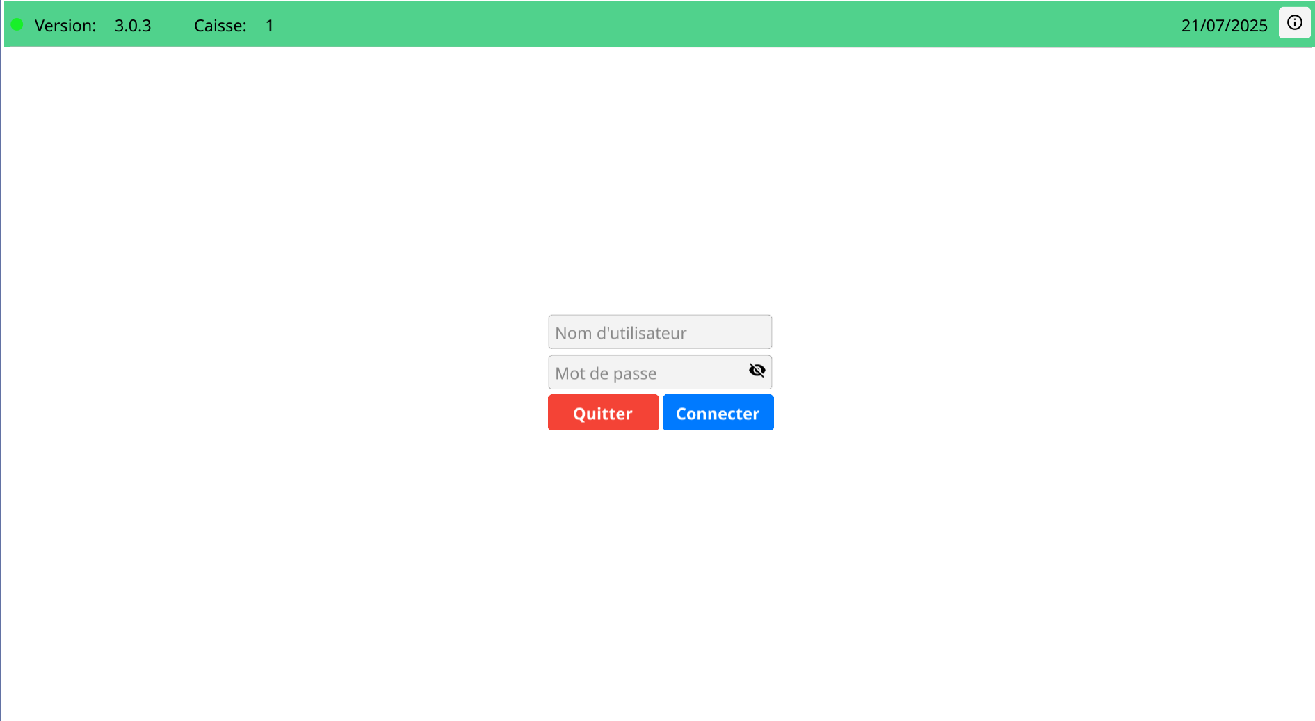 La caisse en mode test affiche un bandeau vert en haut (même signalétique que pour l’environnement de test).