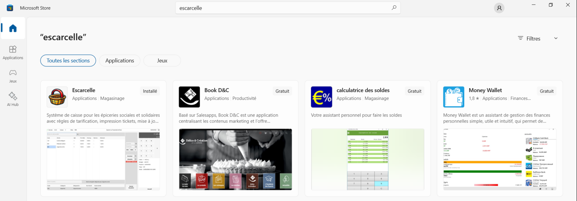 Une fois le Store ouvert, tapez “escarcelle” dans la barre de recherche. L’application devrait apparaître avec un panier doré et une anse rouge. Cliquez dessus pour l’ouvrir puis installez-la.